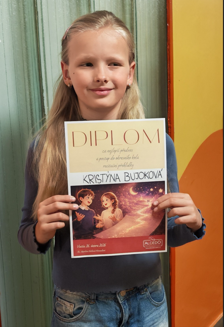 Naše škola má důvod k radosti. Žákyně 3. B Kristýnka Bujoková dosáhla mimořádného úspěch v recitační soutěži, kde postupně zazářila ve 3 kolech. V základním školním kole získala krásné 1. místo a postoupila tak do okrskového kola ve Vsetíně. Ani tam nenašla přemožitele a opět si odnesla 1. místo. Díky tomu postoupila do kola okresního v Rožnově pod Radhoštěm, kde se v silné konkurenci umístila na výborném 3. místě.