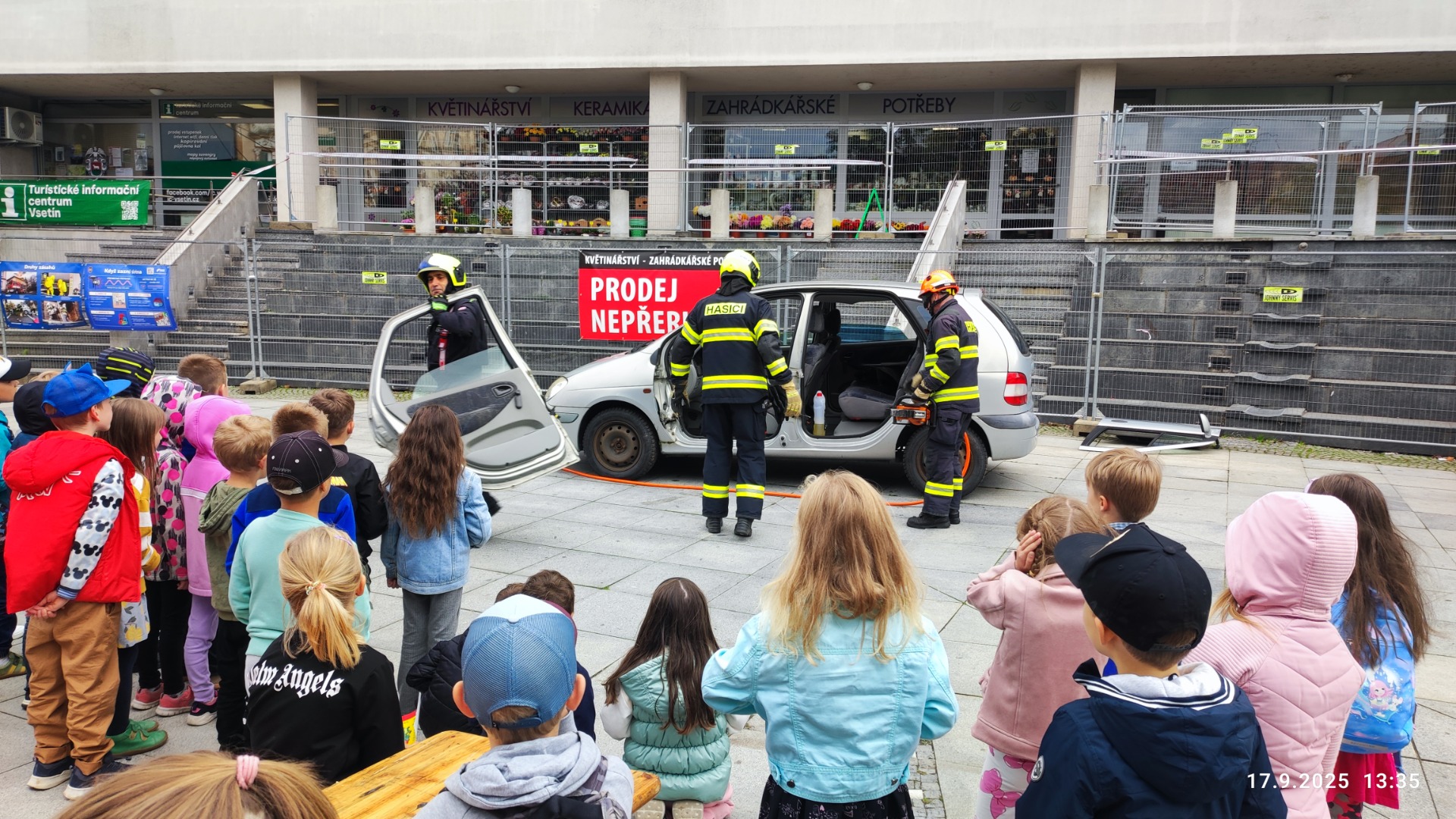 Ve středu 17. 9. jsme se v rámci Evropského týdne mobility zúčastnili akce "Den bez aut" na Dolním náměstí ve Vsetíně. Viděli jsme simulaci vyprošťování z havarovaného vozidla, s policisty jsme si zopakovali základy bezpečné jízdy na kole, prohlédli si hasičské auto, vyrobili si tematické placky.