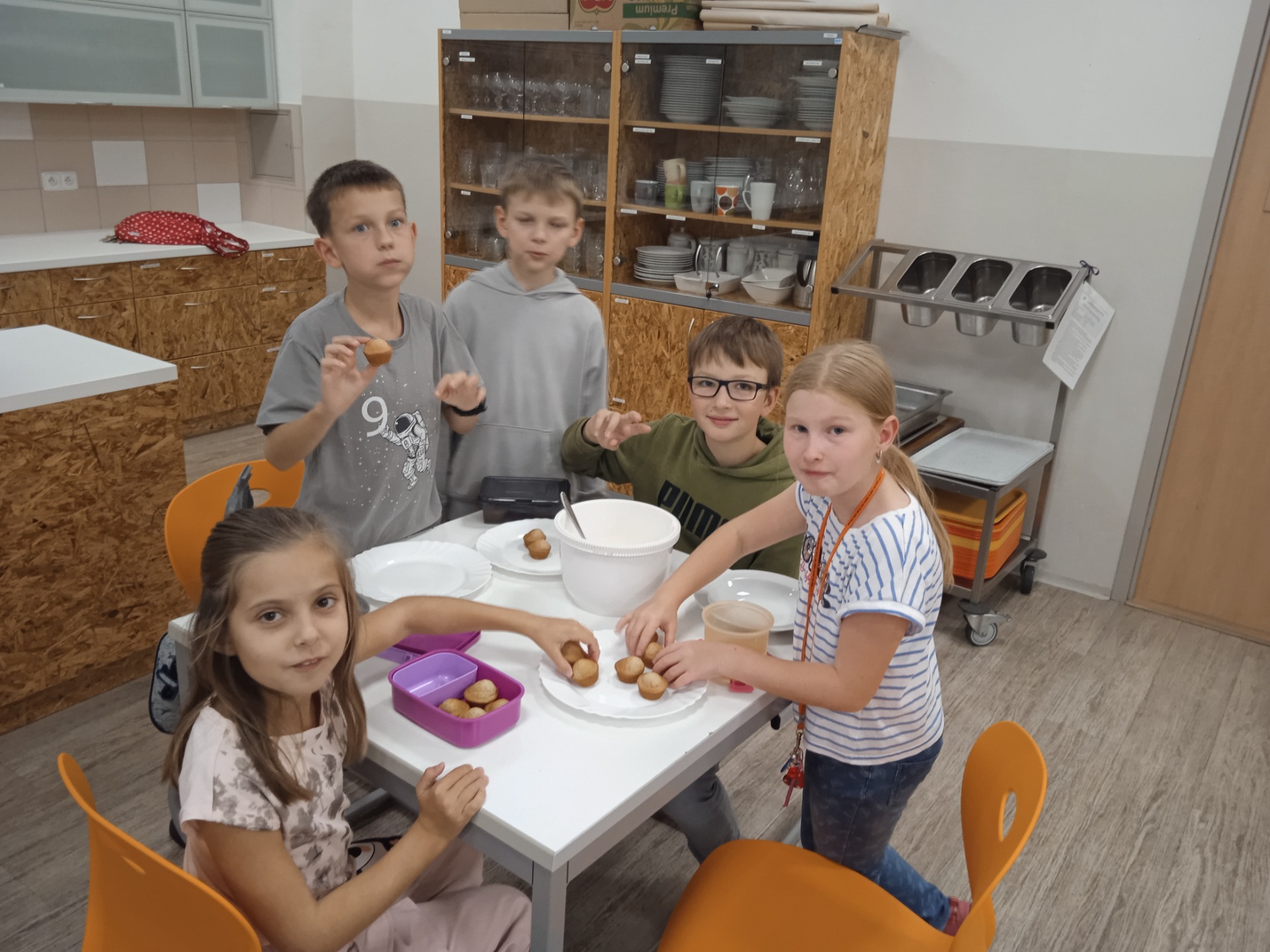 S dětmi jsme rozvoněli školní kuchyňku jablíčkovými muffiny se šlehačkou. Děti pečení moc bavilo a dobroty se jim povedly - nezbylo nic :)